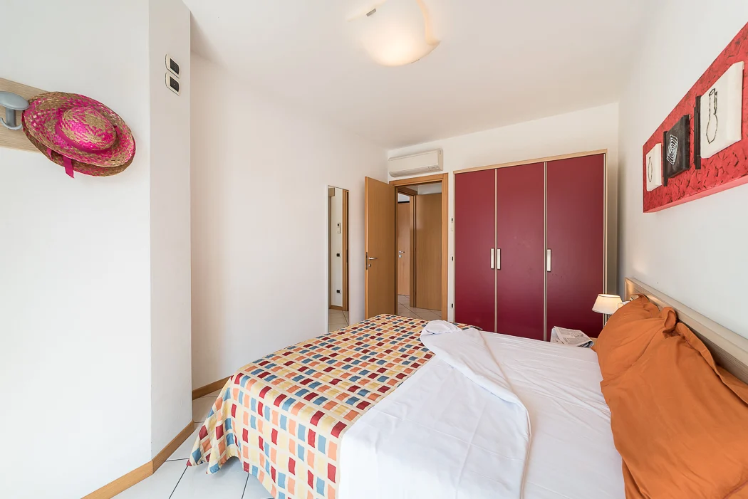 BILOCALE al piano terra con 2-4 posti, composto da: soggiorno con divano letto doppio, 1 camera con 2 letti singoli eventualmente unibili, angolo cottura, bagno, ampio terrazzo coperto, giardinetto privato, garage.