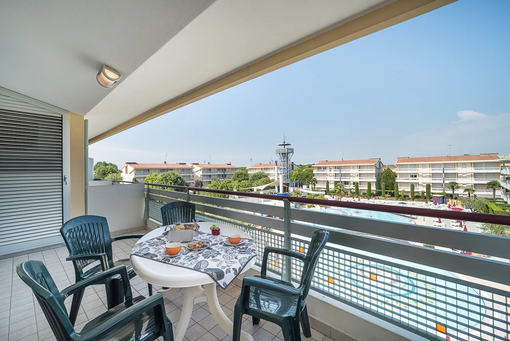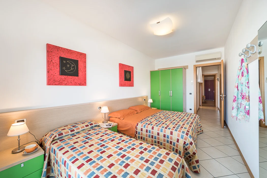 TRILOCALE con 5-6 posti letto, composto da: soggiorno con divano letto doppio, 1 camera con 2 letti singoli eventualmente unibili, 1 camera con 2 letti singoli unibili e terzo letto, angolo cottura, bagno, ampio terrazzo coperto, posto auto riservato nel pergolato.