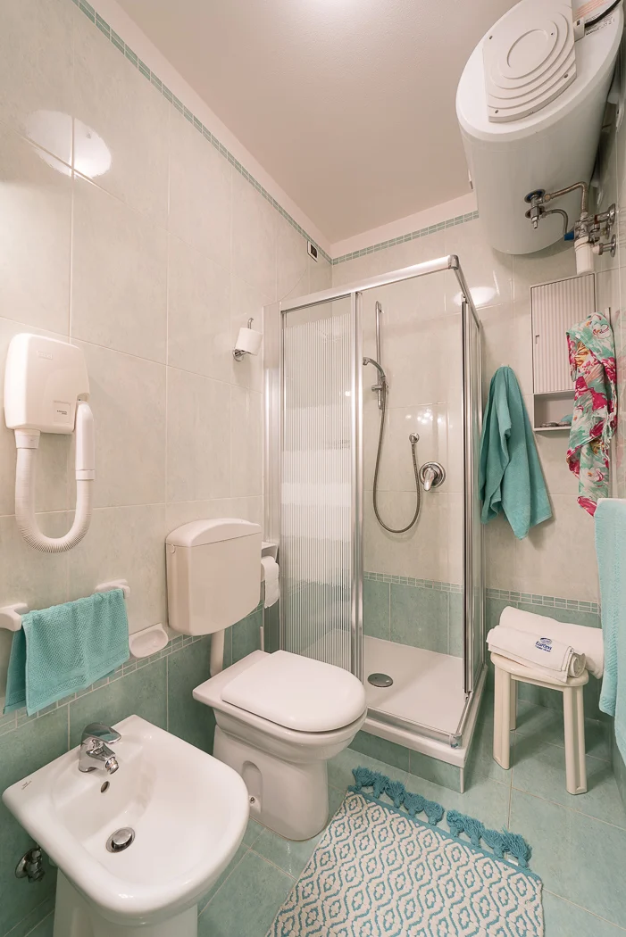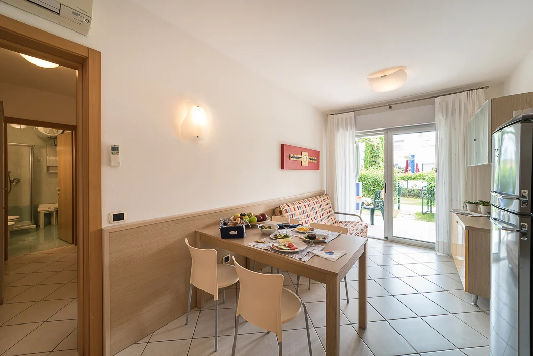 TRILOCALE al piano terra con 5-6 posti letto, composto da: soggiorno con divano letto doppio, 1 camera con 2 letti singoli eventualmente unibili, 1 camera con 2 letti singoli unibili e terzo letto, angolo cottura, bagno, ampio terrazzo coperto, giardinetto privato, posto auto riservato nel pergolato.