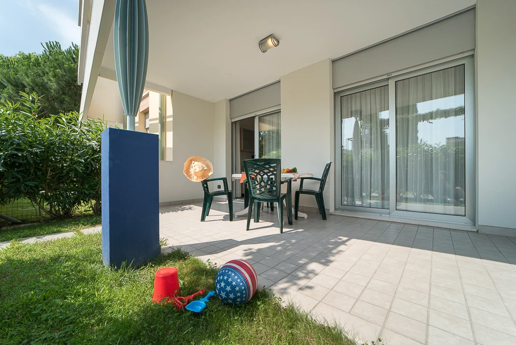 Trilo v přízemí 5-6 lůžek, složený z: obývací pokoj s rozkládacím 2-lůžkov ým gaučem, 1 pokoj se dvěma 1-lůžky (změnitelné v manželské lůžko), 1 pokoj se dvěma 1-lůžky (změnitelné v manželské lůžko) a třetí 1-lůžko, kuchyňský kout, 1 koupelna, velká krytá terasa, vlastní zahradka, parkovací místo vyhrazené v loubí.