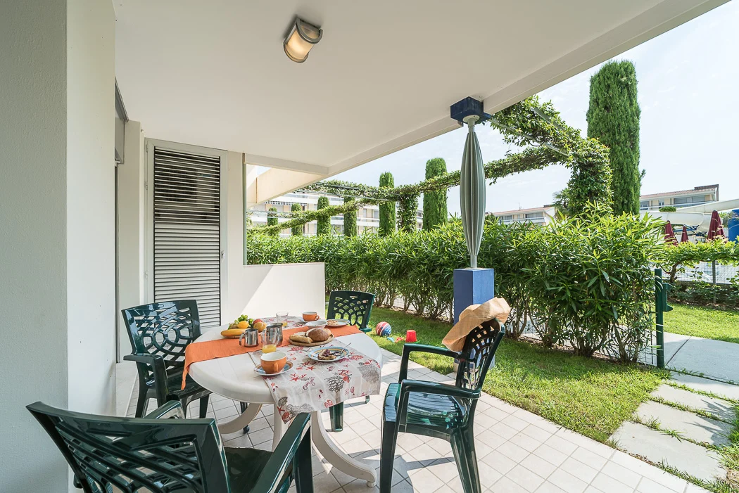 DREIZIMMERWOHNUNG im Erdgeschoss für 5-6 Personen bestehend aus: Wohnzimmer mit Doppelschlafcouch, 1 Schlafzimmer mit 2 Einzelbetten (umwandelbar in ein Doppelbett), 1 Schlafzimmer mit 2 Einzelbetten (umwandelbar in ein Doppelbett) und einem dritten Bett, Kochnische, 1 Badezimmer, grossem überdachten Balkon, privatem Garten, reservierter Autoabstellplatz unter der Pergola.