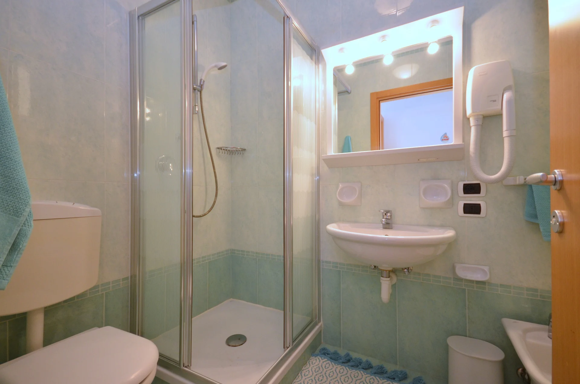 THREE-ROOM-APARTMENT for 5-6 persons, composed of: living-room with a double divan bed, 1 bedroom with 2 single beds – that can be united, 1 bedroom with 2 single beds – that can be united – and 1 single bed, kitchen corner, bathroom, large covered balcony, garage.