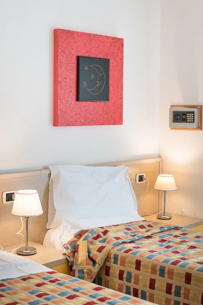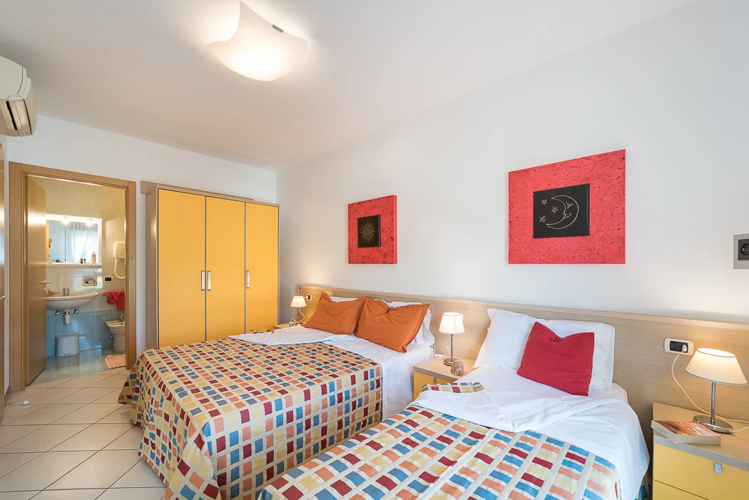 THREE-ROOM-APARTMENT for 5-6 persons, composed of: living-room with a double divan bed, 1 bedroom with 2 single beds – that can be united, 1 bedroom with 2 single beds – that can be united – and 1 single bed, kitchen corner,2 bathrooms, large covered balcony, reserved parking place under the pergola.
