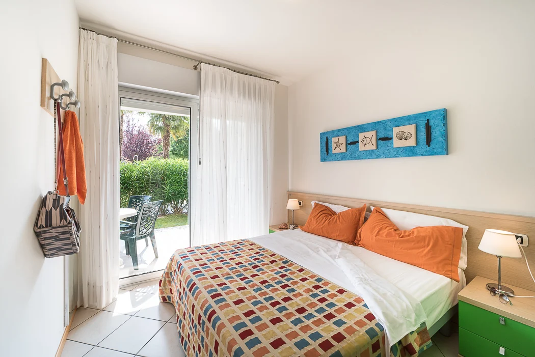 THREE-ROOM-APARTMENT on the ground floor for 5-6 persons, composed of: living-room with a double divan bed, 1 bedroom with 2 single beds – that can be united, 1 bedroom with 2 single beds – that can be united – and 1 single bed, kitchen corner,2 bathrooms, large covered balcony, private garden, garage.