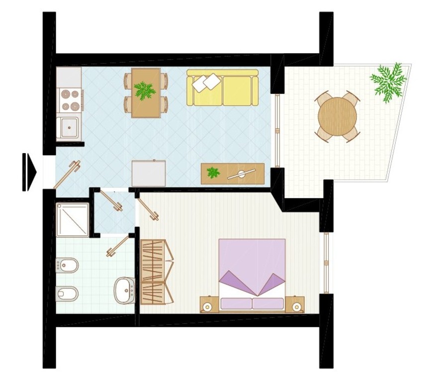 DWUPOKOJOWY apartament dla maks. 2-4 osób: pokój dzienny z rozkładanym tapczanem dwuosobowym, 1 sypialnia z 2 łóżkami (z możliwością złączenia), aneks kuchenny, łazienka, obszerny zadaszony balkon, garaż.